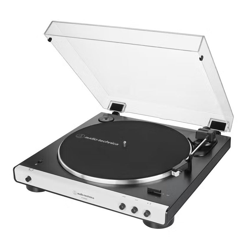 Audio Technicas fully automatic belt driven turntable with bluetooth - white front plate, black chassis.